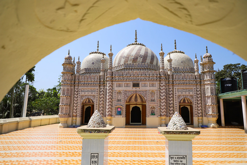 Bajra Shahi Jame Masjid was founded by Aman Ullah at 18th century (1741-42) during the reign of the Mughal emperor Muhammad Shah. Further, local proprietor Khan Bahadur Ali Ahmad and Khan Bahadur Mujir Uddin Ahmad had repaired and decorated it extensively with mosaics colored shards within 1911 to 1928. This mosque is located at Bazra union under Sonaimuri Upazila from 20 kilometers north of Noakhali Capital, Bangladesh and is called the "Most Notable Historical Monument" in this region. The mosque has rectangular shape which contains three domes, the middle one larger than those on either side, and octagonal towers at the four corners. The eastern facade has three doorways, the central one larger than the others. The north and south sides each has a similar doorway. The interior is divided into three bays by two multi-cusped arches. Besides, this mosque has been listed as preservation and protected sites in Department of Archaeology, Bangladesh.